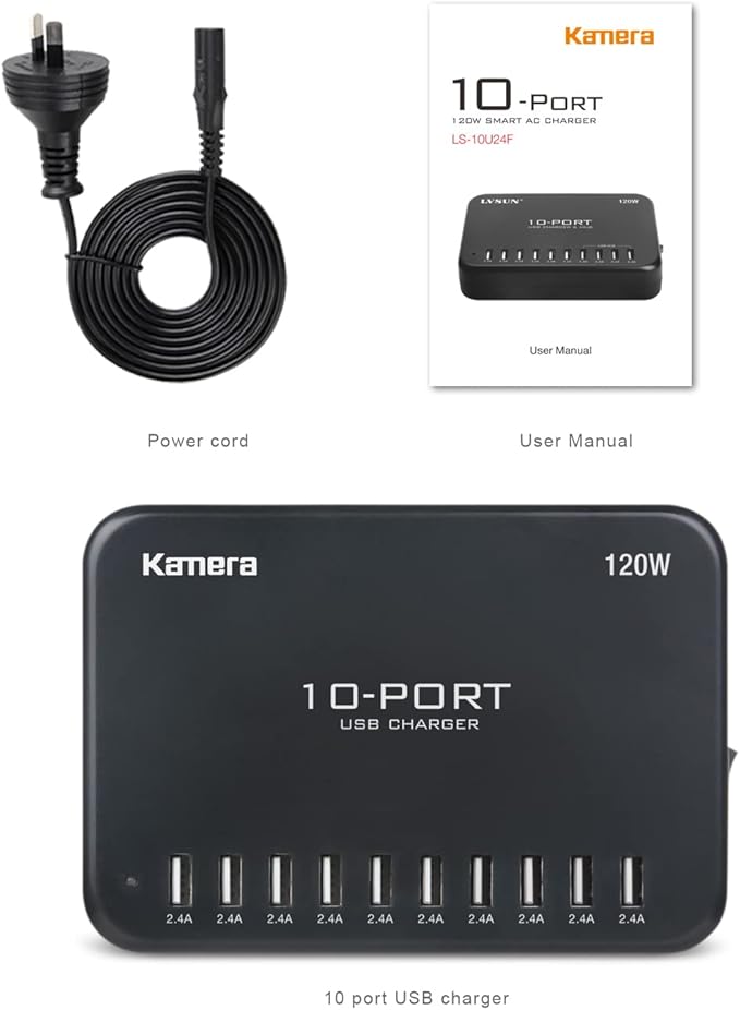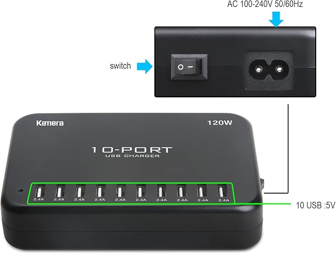 - It provides 10 individual USB ports, each with a 2.4 A output for fast charging.