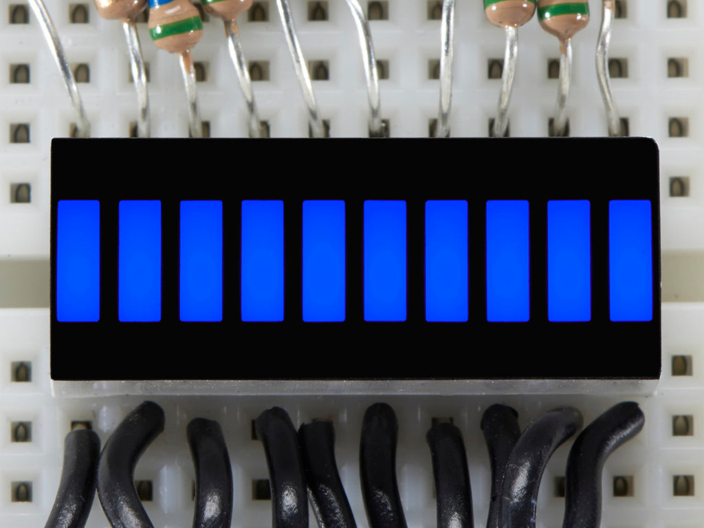 Make a small linear display with a glowing blue color using this elegant LED bargraph. Only 1" long, it is quite visible but not so large it wont plug into a breadboard! 10 LEDs are contained in the plastic body. This display is bright, beautiful and funky with nice diffused rectangular lenses for a striking look. There are 20 pins,10 on each side, with 0.1" spacing so you can easily plug it into a breadboard with plenty of space for wiring left over.