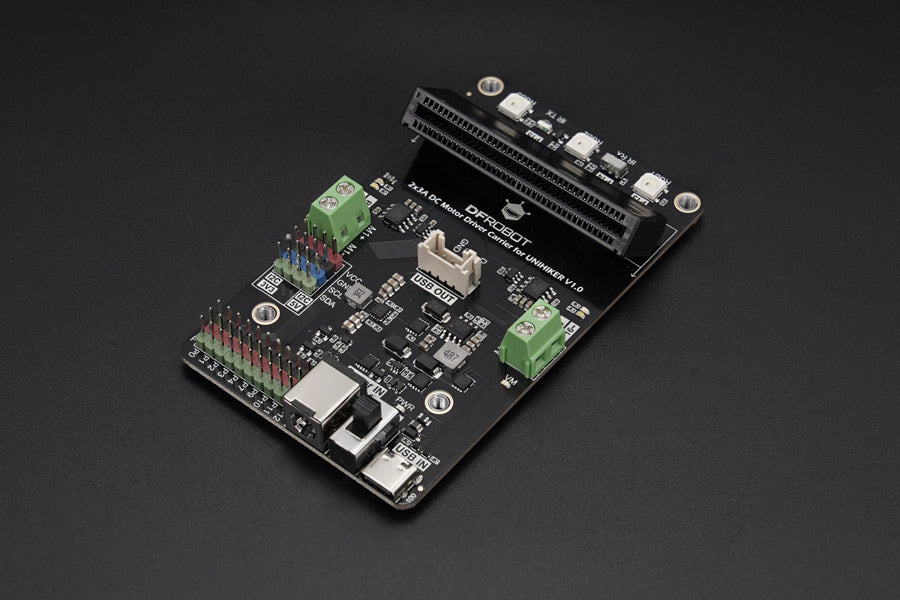 This motor driver carrier board is a specially designed carrier for the UNIHIKER, featuring a tilted edge connector slot that provides the screen with the optimal viewing angle. It integrates a dual DC motor drive that can be powered separately, offering flexible power supply options including USB, DC head, and terminal block. The board also includes onboard RGB lights and infrared transmission and reception functions, enhancing its playability and versatility. It extends 10*3Pin ports and 4*I2C ports, supporting 5V I2C for stronger compatibility and making it highly expandable.