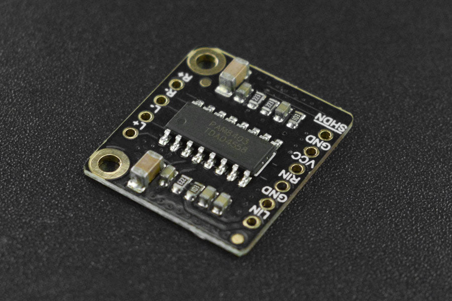This is a Mini Audio Stereo Amplifier from DFRobot. It has left and right channels that can realize stereo surround sound. The module has a mini body and 2.54mm pin pitch, convenient to be embedded into any device. Using a Stereo Enclosed Speaker (FIT0502), you can directly control the audio amplifier without programming.