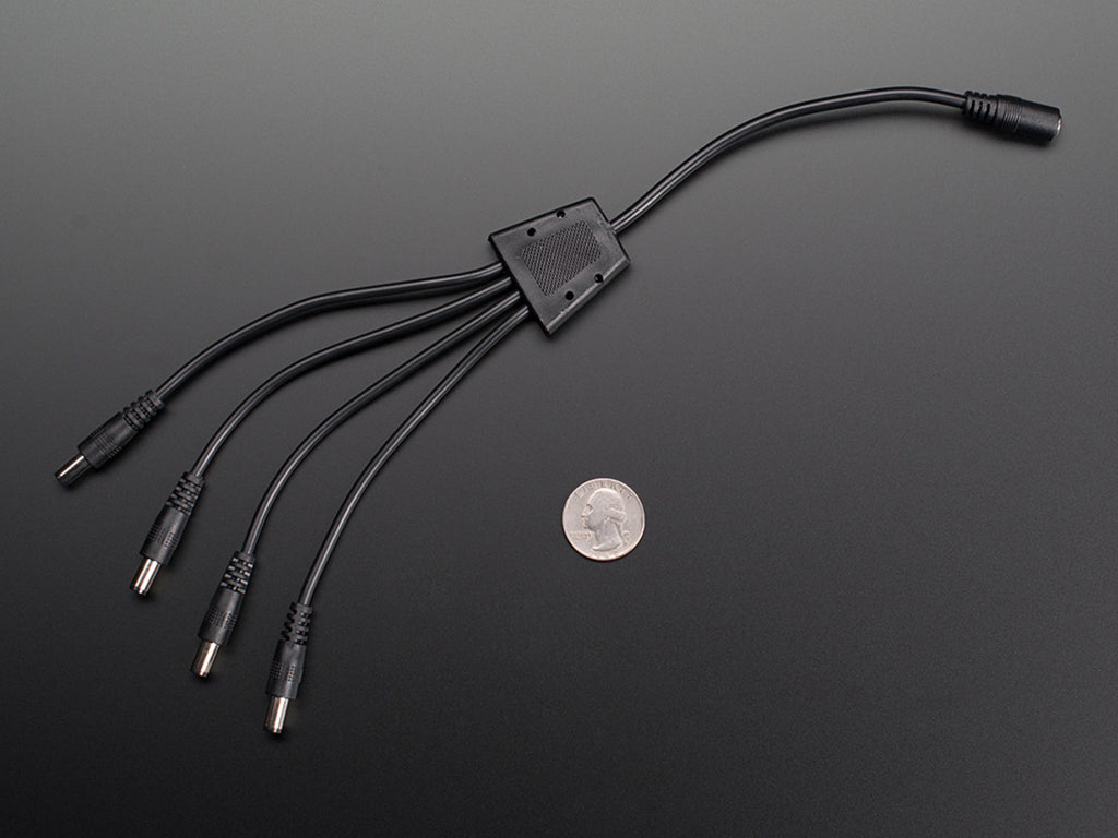 Quadruple your power adapters with this wonderfully simple 4-way power jack splitter. All you have to do is connect a standard 5.5mm/2.1mm sized plug into one end, and behold, four identical plugs to use! We like the rugged molding on these adapters, and they're really handy when you have a project with multiple pluggable devices.