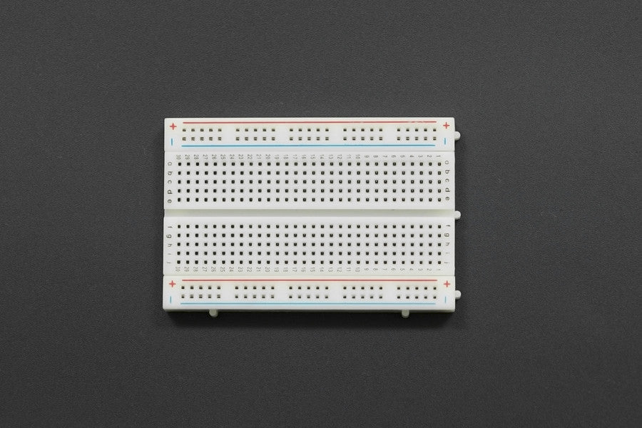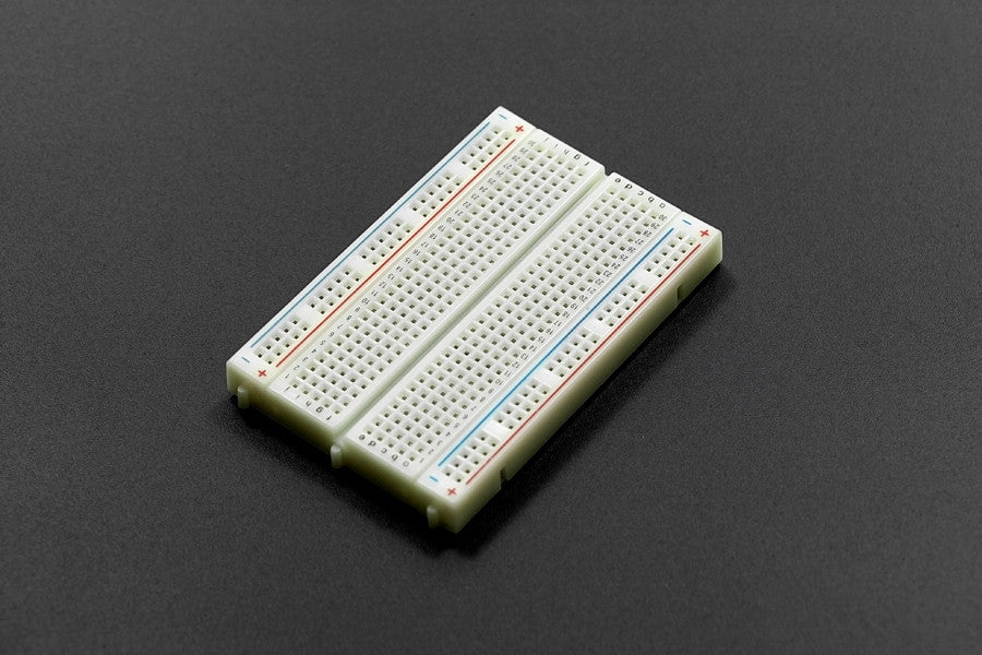 The 400 Tie Point Interlocking Solderless Breadboard is a cute half size breadboard, good for small projects. It is 8.2cm x 6.2cm in size with a standard double-strip in the middle and two power rails on both sides. You can pull the power rails off easily to make the breadboard as thin as 3.5cm and stick it onto an Arduino protoshield. You can also cut these in half with a saw to create 2 tiny breadboards, or "snap" these breadboards together either way to make longer or wider breadboards.