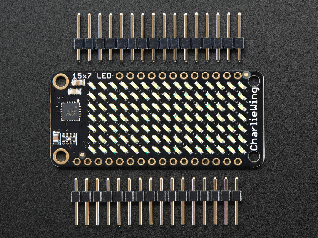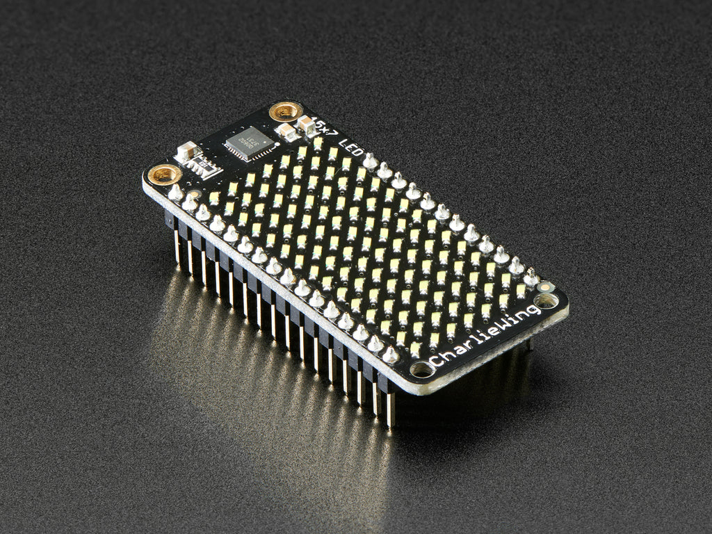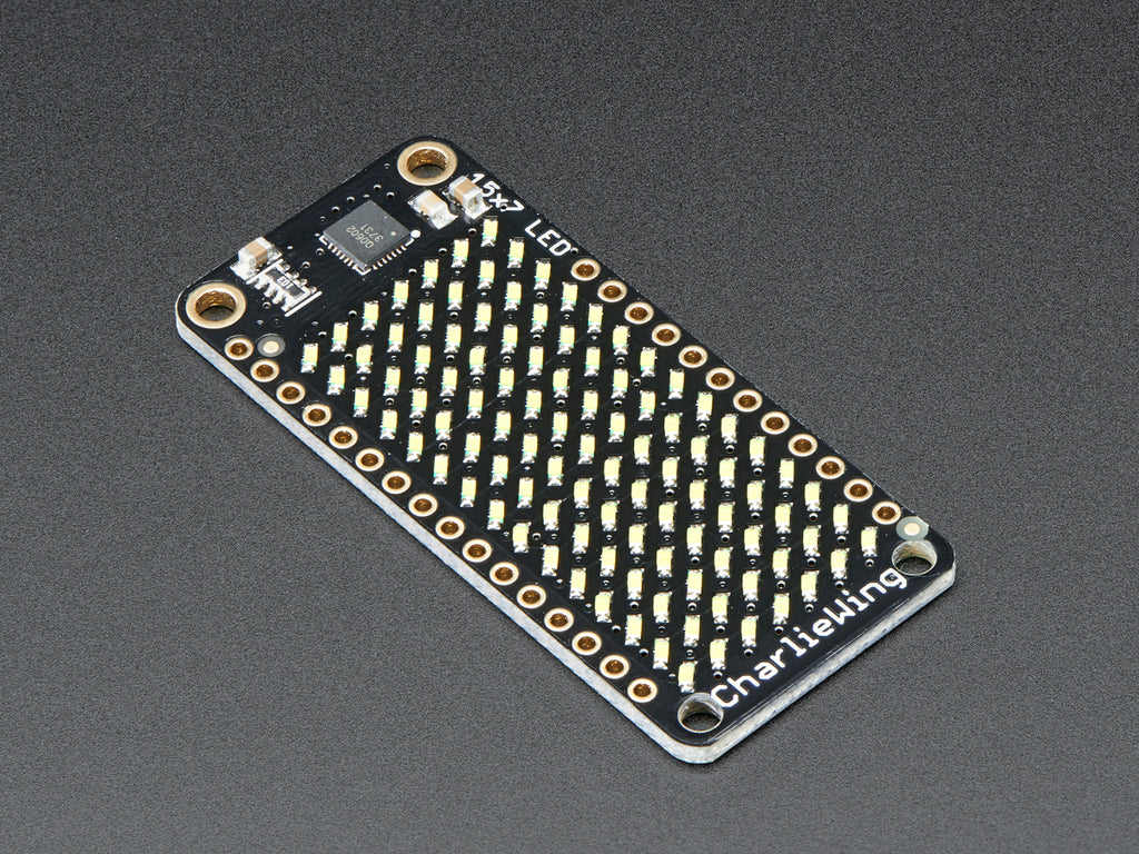 What is particularly nice about this Wing is the I2C LED driver chip has the ability to PWM each individual LED in a 15x7 grid so you can have beautiful LED lighting effects, without a lot of pin twiddling. Simply tell the chip which LED on the grid you want lit, and what brightness and it's all taken care of for you. You get 8-bit (256 level) dimming for each individual LED.