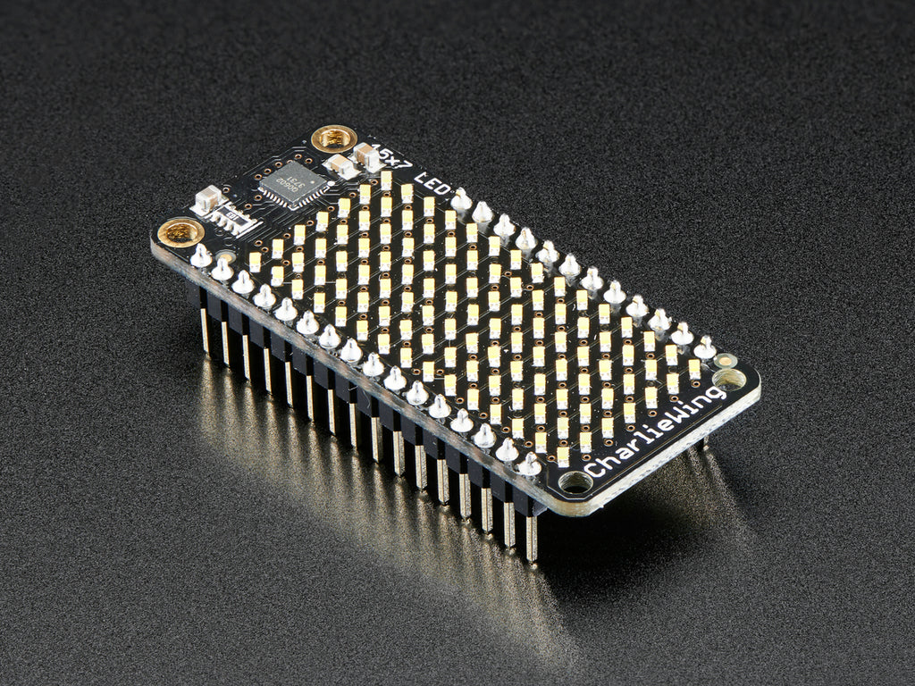 What is particularly nice about this Wing is the I2C LED driver chip has the ability to PWM each individual LED in a 15x7 grid so you can have beautiful LED lighting effects, without a lot of pin twiddling. Simply tell the chip which LED on the grid you want lit, and what brightness and it's all taken care of for you. You get 8-bit (256 level) dimming for each individual LED.