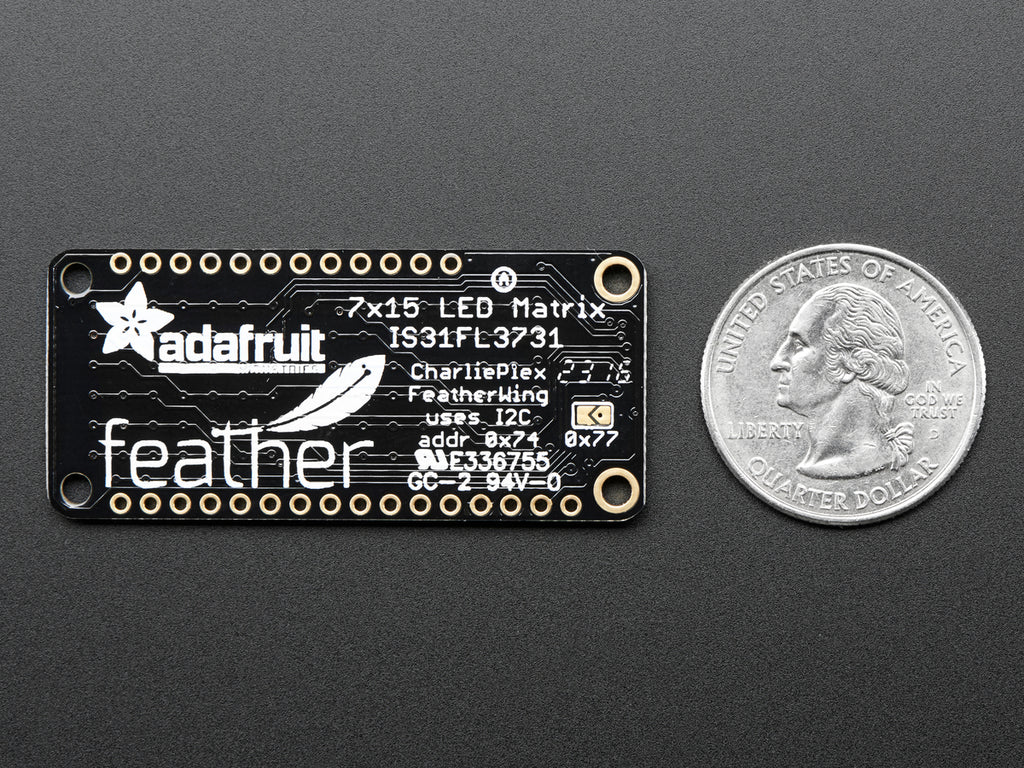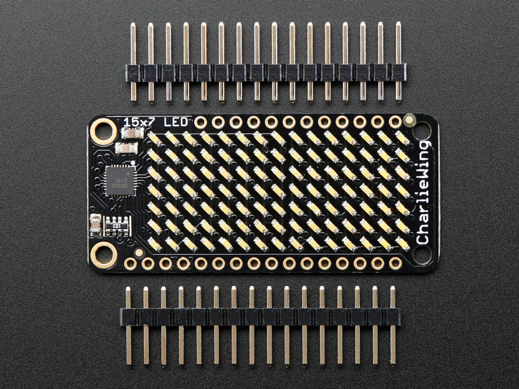 You wont be able to look away from the mesmerizing patterns created by this Adafruit 15x7 CharliePlex LED Matrix Display FeatherWing. This 15x7 LED display can be paired with any of our Feather boards for a beautiful, bright grid of 105 charlieplexed LEDs. It even comes with a built-in charlieplex driver that is run over I2C.
