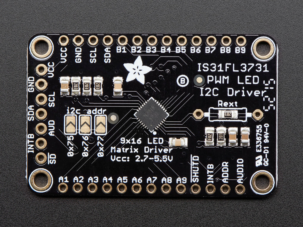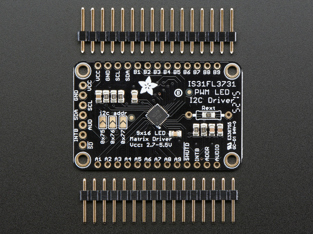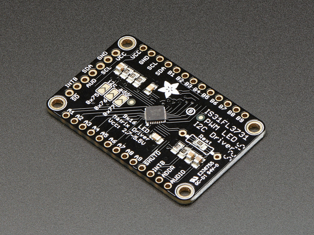 The IS31FL3731 is a nice little chip - it can use 2.7-5.5V power and logic so its flexible for use with any microcontroller. You can set the address so up to 4 matrices can share an I2C bus. Inside is enough RAM for 8 seperate frames of display memory so you can set up multiple frames of an animation and flip them to be displayed with a single command.