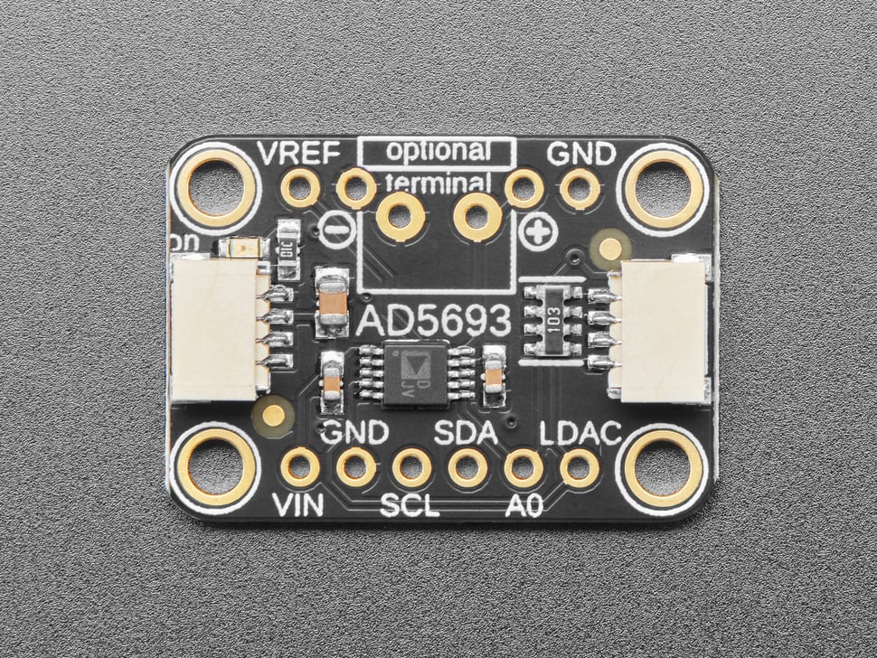 Compared to a 12-bit DAC like the MCP4725, the AD5693 provides more resolution with 16-bits of precision. There may be some cost savings with a 12-bit DAC, but when precision is a priority, then the Adafruit AD5693R Breakout Board with its I2C interface and temperature compensated 2.5V internal reference provides high-precision output in a compact size.