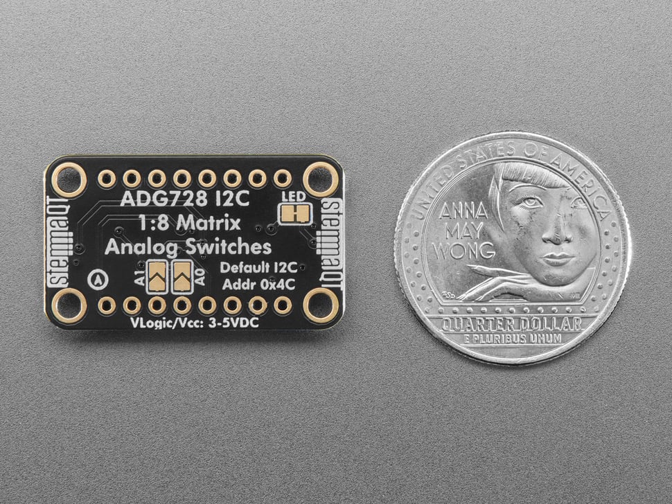 The Adafruit ADG728 1-to-8 Analog Matrix Switch is an ideal alternative to relays for those seeking a smaller and lower-power technology that will not wear out mechanically. It can easily connect up to eight analog signals, functioning similarly to a set of eight mechanical switches. This conveniently-designed breakout allows for use of the ADG728 switch with signals up to 5V, eliminating any need for intricate soldering.