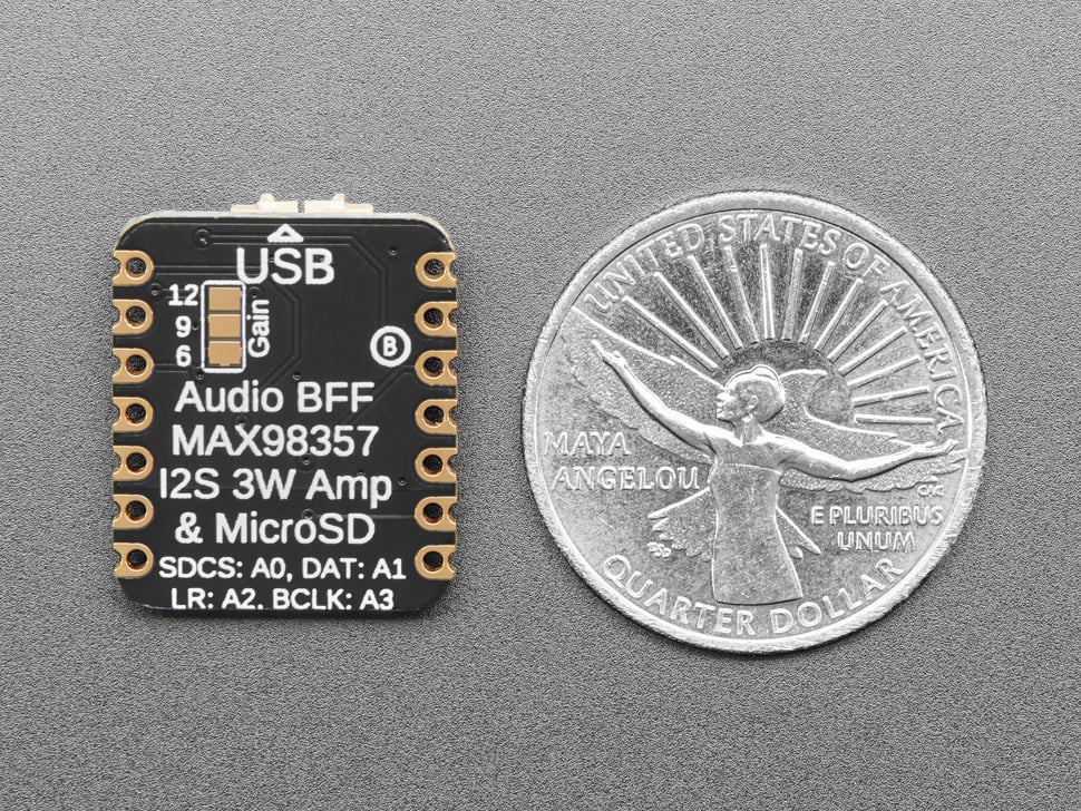 This BFF comes with a MicroSD card slot that can address up to 64 GB of storage and a I2S 3 Watt amplifier, for high-quality audio playback, that can fit on the back of your miniature dev board. All together uses the SPI port plus 4 GPIO pins for card CS, and I2S data, clock and left-right select.