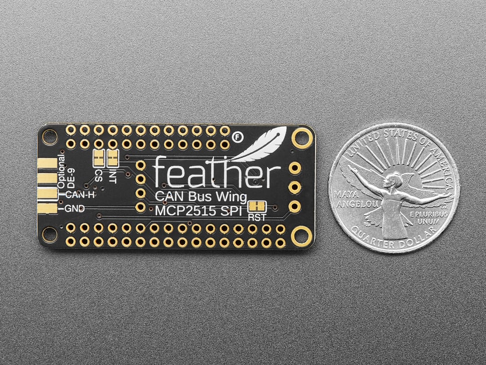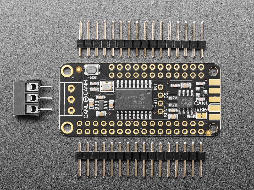 If you'd like to connect your Feather to a CAN Bus, the Adafruit CAN Bus FeatherWing with MCP2515 controller and TJA1051/3 transceiver will work with any and all Feathers! The controller used is the MCP2515, an extremely popular and well-supported chipset that has drivers in Arduino and CircuitPython and only requires an SPI port and two pins for chip-select and IRQ. Use it to send and receive messages in either standard or extended format at up to 1 Mbps.