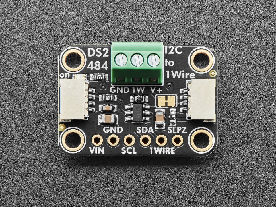 By customer request, this is a DS2484 Stemma QT board that uses a I2C-to-1W controller chip, with ESD protection and support for split supplies. You can easily connect it to an existing I2C bus and then use the screw terminals to attach multiple DS18B20's, or pair it with our 1-Wire chaining breakouts for fancier experimentation.