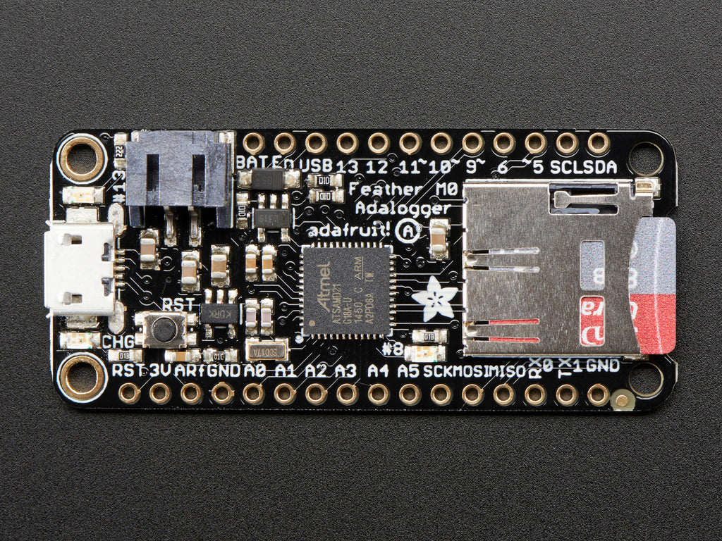 This is the Adafruit Feather M0 Adalogger - our take on an 'all-in-one' Cortex M0 datalogger (or data-reader) with built in USB and battery charging. Its an Adafruit Feather M0 with a microSD holder ready to rock! We have other boards in the Feather family, check'em out here
