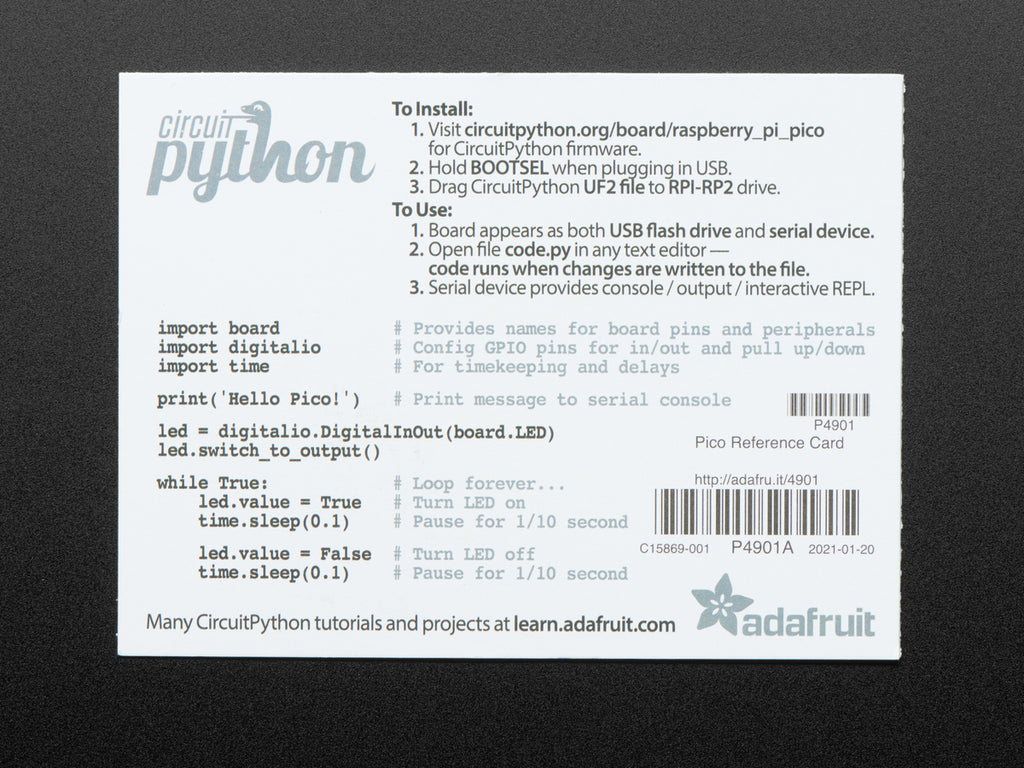 On the back we have a quick start guide for loading CircuitPython onto your pico and blinking the on-board LED. All on a 3" x 4" card!