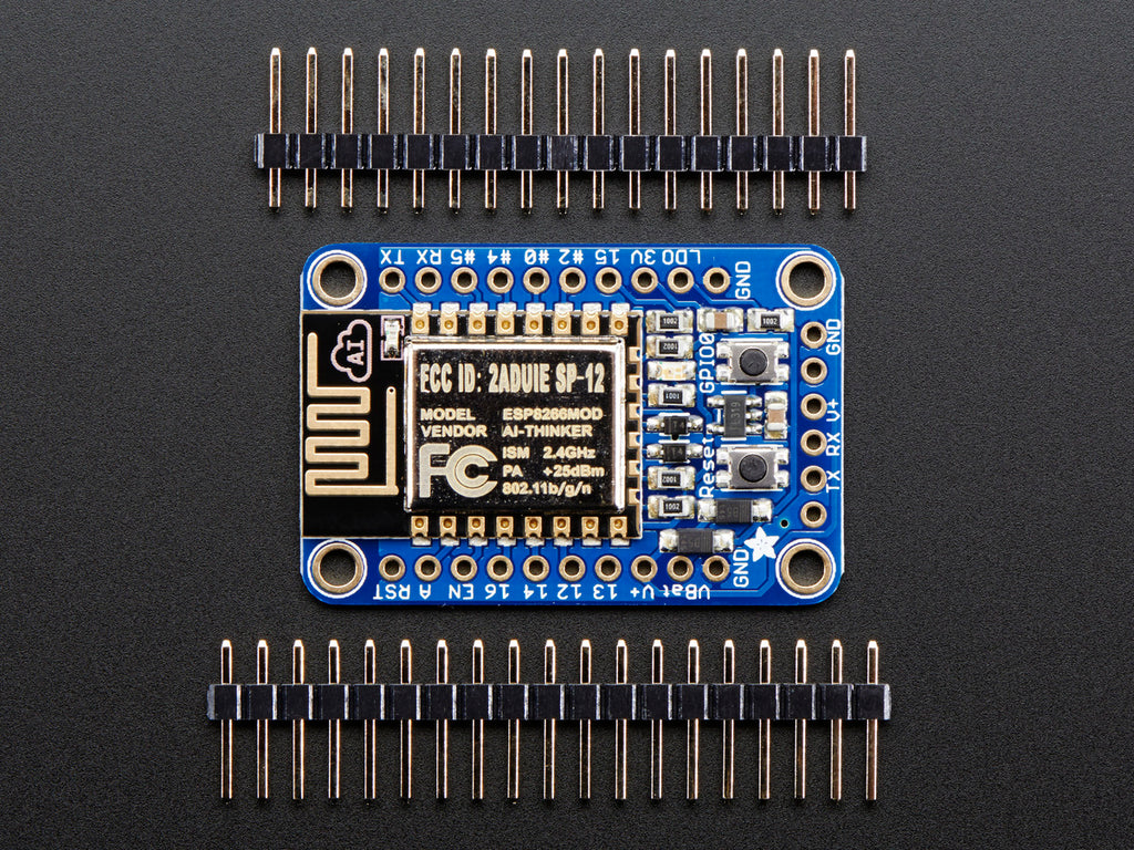 The Adafruit HUZZAH ESP8266 breakout is what we designed to make working with this chip super easy and a lot of fun. We took a certified module with an onboard antenna, and plenty of pins, and soldered it onto our designed breakout PCBs. We added in: