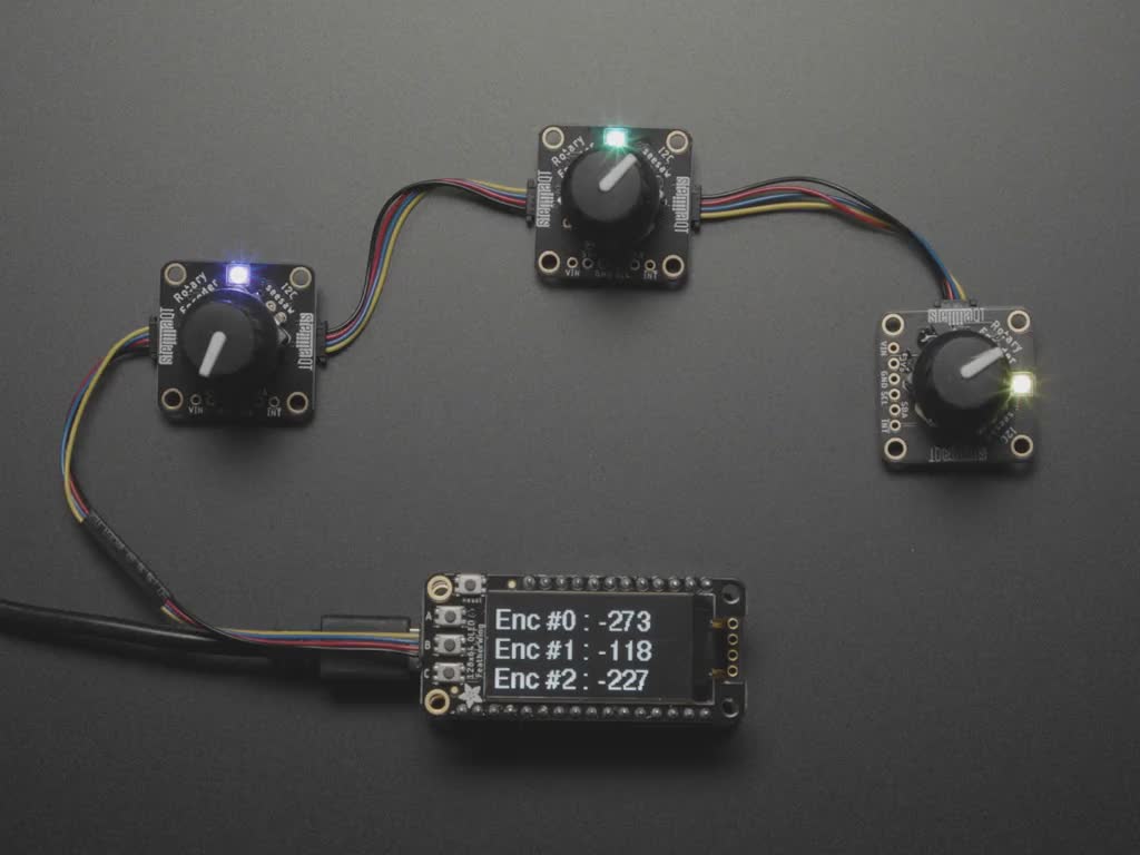 Using the three onboard address jumpers, you can connect up to 8 of these rotary encoders on a single I2C port. The first one will be at address 0x36, the last one at 0x3D when all three jumpers are soldered closed.