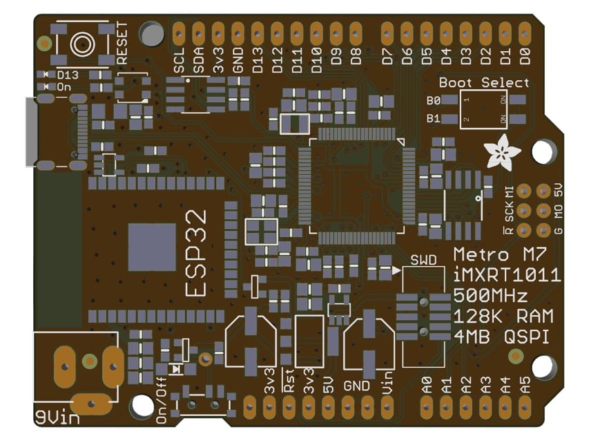 Get ready for our fastest Metro ever - the NXP iMX RT1011 microcontroller powers this board with a 500 MHz ARM Cortex M7 processor. There's 4 MB of execute-in-place QSPI for firmware + disk storage and 128KB of SRAM in-chip