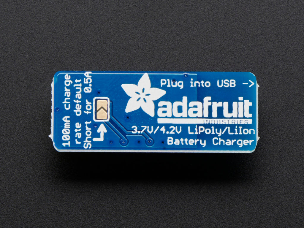 - 100mA charge current, adjustable to 500mA by soldering a jumper closed
