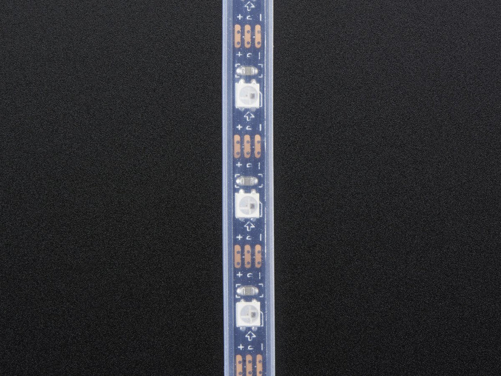 There are 60 RGB LEDs per meter, and you can control each LED individually! Yes, that's right, this is the digitally-addressable type of LED strip. You can set the color of each LED's red, green and blue component with 8-bit PWM precision (so 24-bit color per pixel). The LEDs are controlled by shift-registers that are chained up down the strip so you can shorten or lengthen the strip. Only 1 digital output pin are required to send data down. The PWM is built into each LED-chip so once you set the color you can stop talking to the strip and it will continue to PWM all the LEDs for you