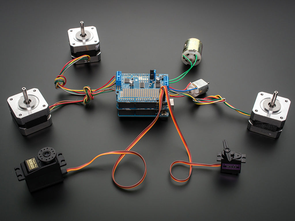 Comes with an assembled & tested shield, terminal block, plain header, jumper. Some soldering is required to assemble the headers on. Stacking headers not included, but we sell them in the shop so if you want to stack shields, please pick them up at the same time. Arduino and motors are not included but we have lots of motors in the shop and all our hobby servos, DC motors, and stepper motors work great.