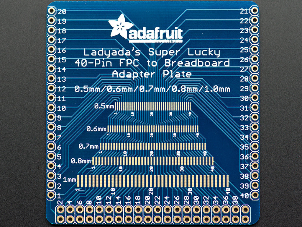 You will roll lucky 7's and connect to nearly any kind of FPC/flex cable with Ladyada's Super Lucky 40-pin FPC to breadboard adapter plate. You get 40 pads of 0.5mm, 0.6mm, 0.7mm, 0.8mm or 1.0mm. It may even work for some 2.0mm pitch connectors. We designed this for use in house, to quickly connect to FPCs we need to test. But we also thought it might be useful for our customers. Each pad is broken out to both a 2x20 0.1" spaced header as well as two strips of 20-pin long 0.1" spaced header 2.1" inches apart. It can accommodate most ZIF and snap connectors or just solder the FPC directly on. This adapter will make prototyping much easier on you!