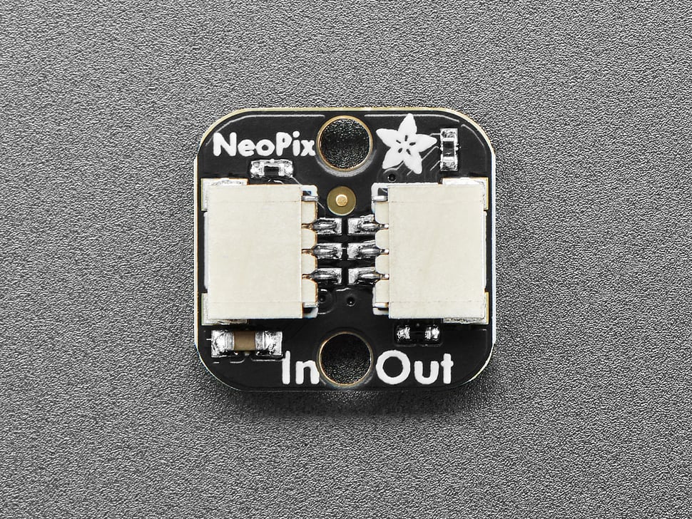 This little breakout makes it easy to add a single NeoPixel to a project, with mounting holes and a pluggable connector. The PCB is less than 0.5"x0.5" and comes with two 3-pin JST SH 1mm pitch connectors for input and output. On the opposite side, a 5050 (5mm square) classic RGB NeoPixel that can be powered and controlled with 3.3V or 5V power.