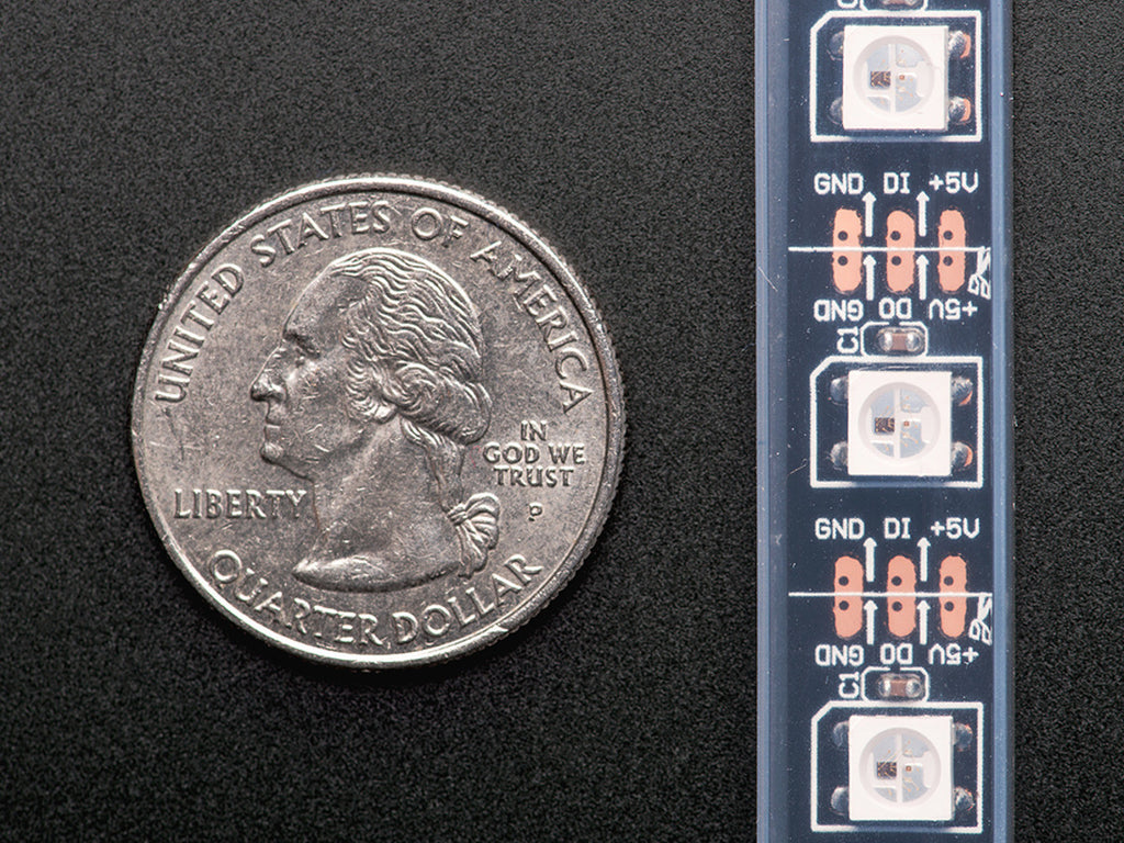 - First up, the higher density means much higher power usage over a certain distance - 18 Watts max (~3.5 Amps @ 5V) per meter instead of 9.6 Watts max (~2 Amps @ 5V). The max rating is assuming all the LEDs are on full white, usually the actual current for colorful design is about 1/3 to 1/2 the max current. A good power supply such as our 5V 10A supply is key!
