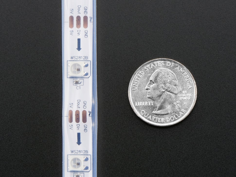 There are 30 RGB LEDs per meter, and you can control each LED individually! Yes, that's right, this is the digitally-addressable type of LED strip. You can set the color of each LED's red, green and blue component with 8-bit PWM precision (so 24-bit color per pixel). The LEDs are controlled by shift-registers that are chained up down the strip so you can shorten or lengthen the strip. Only 1 digital output pin are required to send data down. The PWM is built into each LED-chip so once you set the color you can stop talking to the strip and it will continue to PWM all the LEDs for you