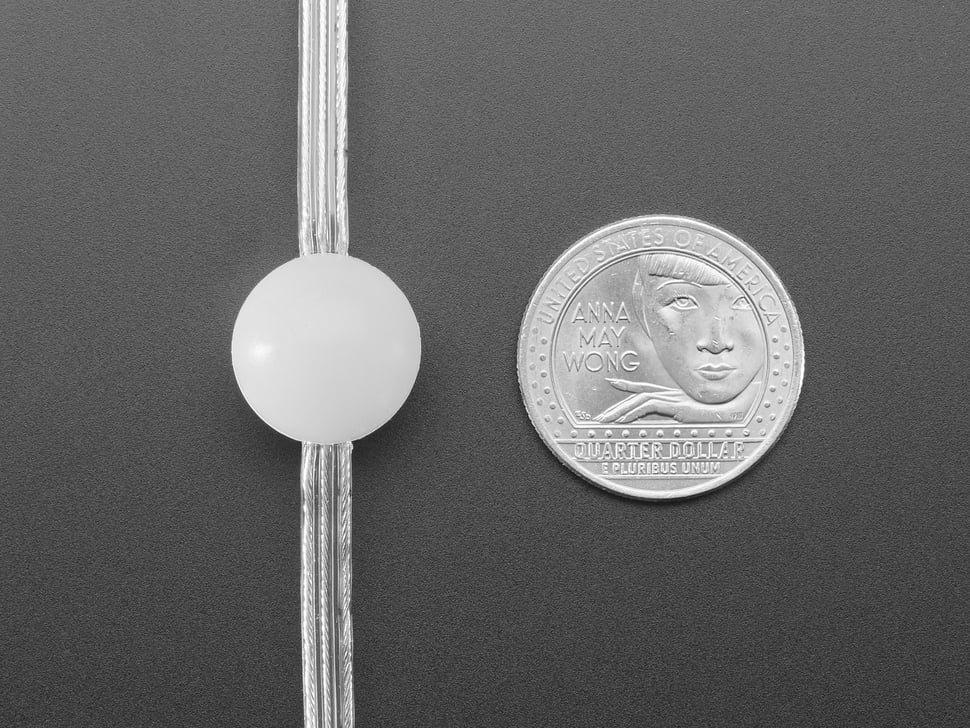 Each strand has 20 balls with a single RGB NeoPixel inside with cabling connecting them. The orbs are 6" apart and are individually addressable with 8 bits per RGB channel, so they can be set to any of 16-million colors.