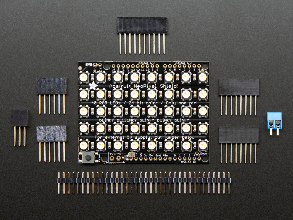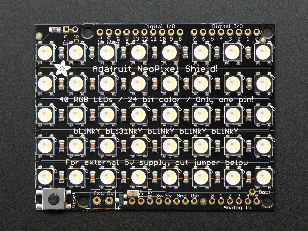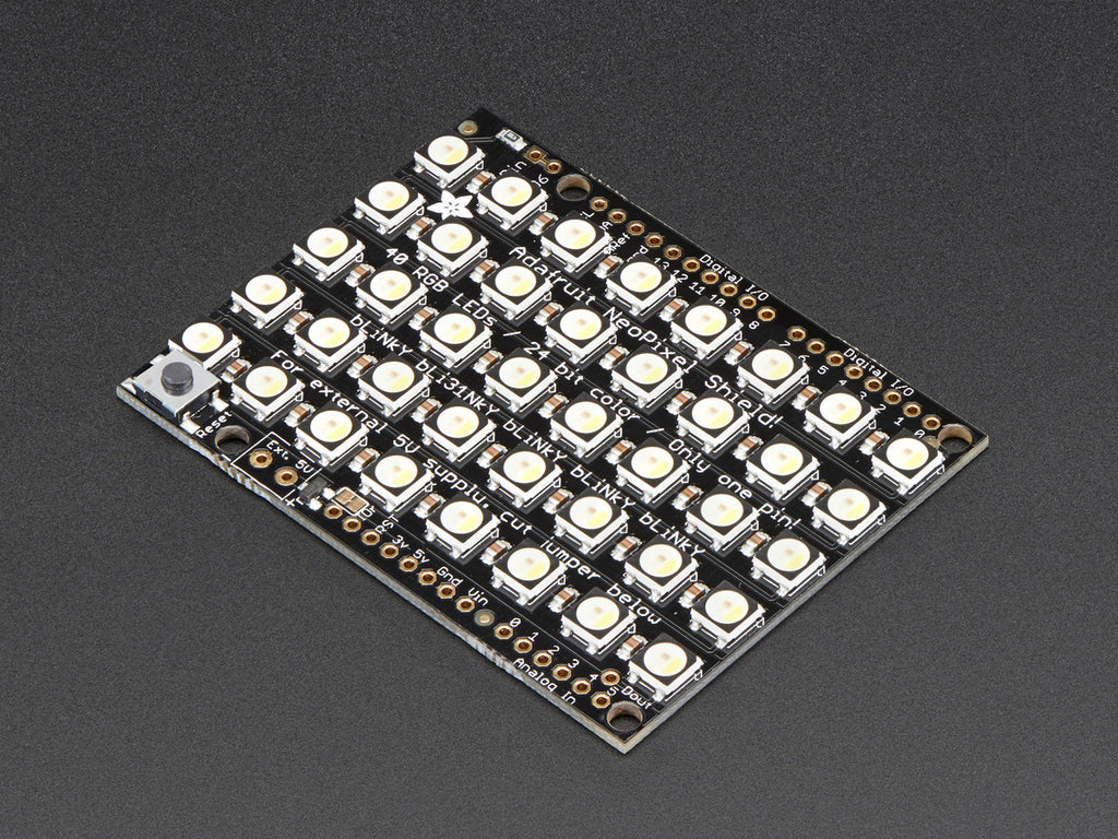 Put on your sunglasses before putting this shield onto your 'duino - 40 eye-blistering RGBW LEDs adorn the NeoPixel shield for a blast of configurable color. Arranged in a 5x8 matrix, each pixel is individually addressable. Only one pin (Digital #6) is required to control all the LEDs. You can cut a trace and use nearly any other pin if you need some customization.