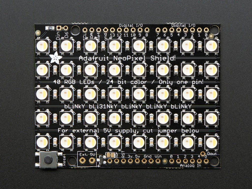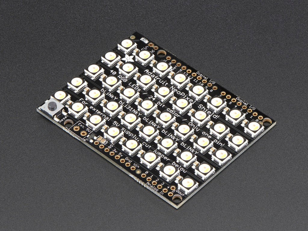 Put on your sunglasses before putting this shield onto your 'duino - 40 eye-blistering RGBW LEDs adorn the NeoPixel shield for a blast of configurable color. Arranged in a 5x8 matrix, each pixel is individually addressable. Only one pin (Digital #6) is required to control all the LEDs. You can cut a trace and use nearly any other pin if you need some customization.