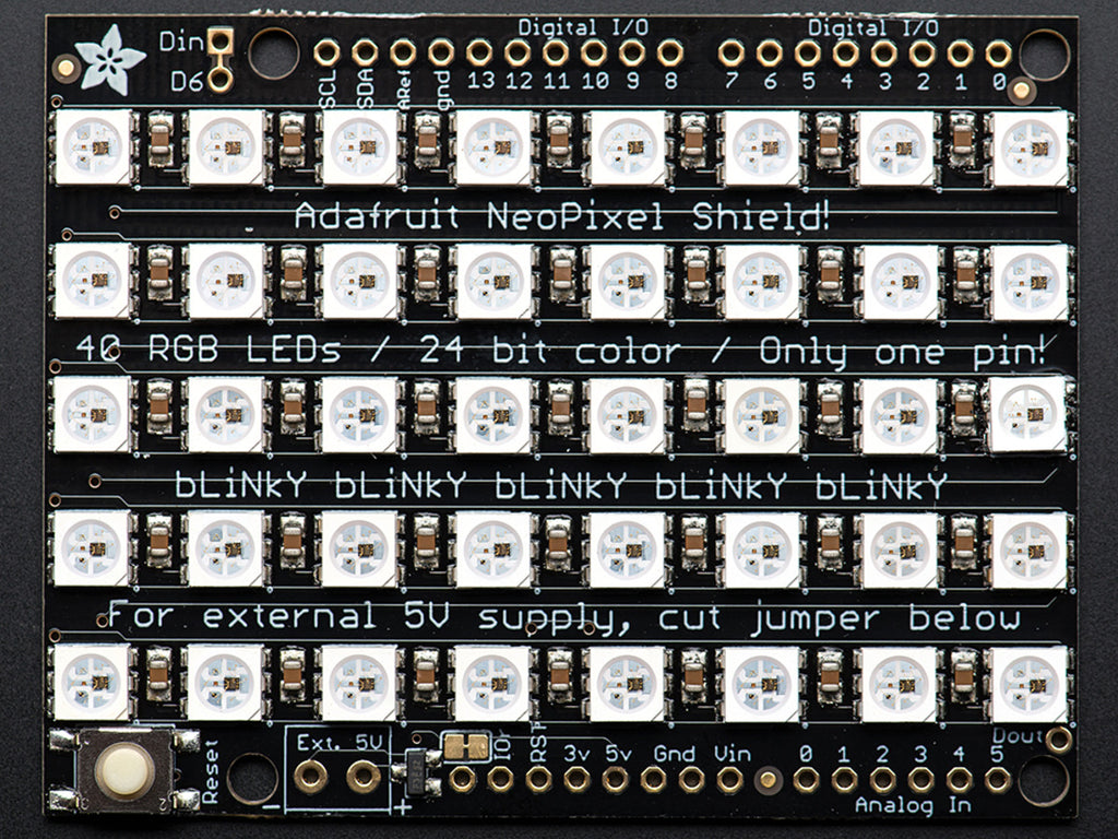 Put on your sunglasses before putting this shield onto your 'duino - 40 eye-blistering RGB LEDs adorn the NeoPixel shield for a blast of configurable color. Arranged in a 5x8 matrix, each pixel is individually addressable. Only one pin (Digital #6) is required to control all the LEDs. You can cut a trace and use nearly any other pin if you need some customization.