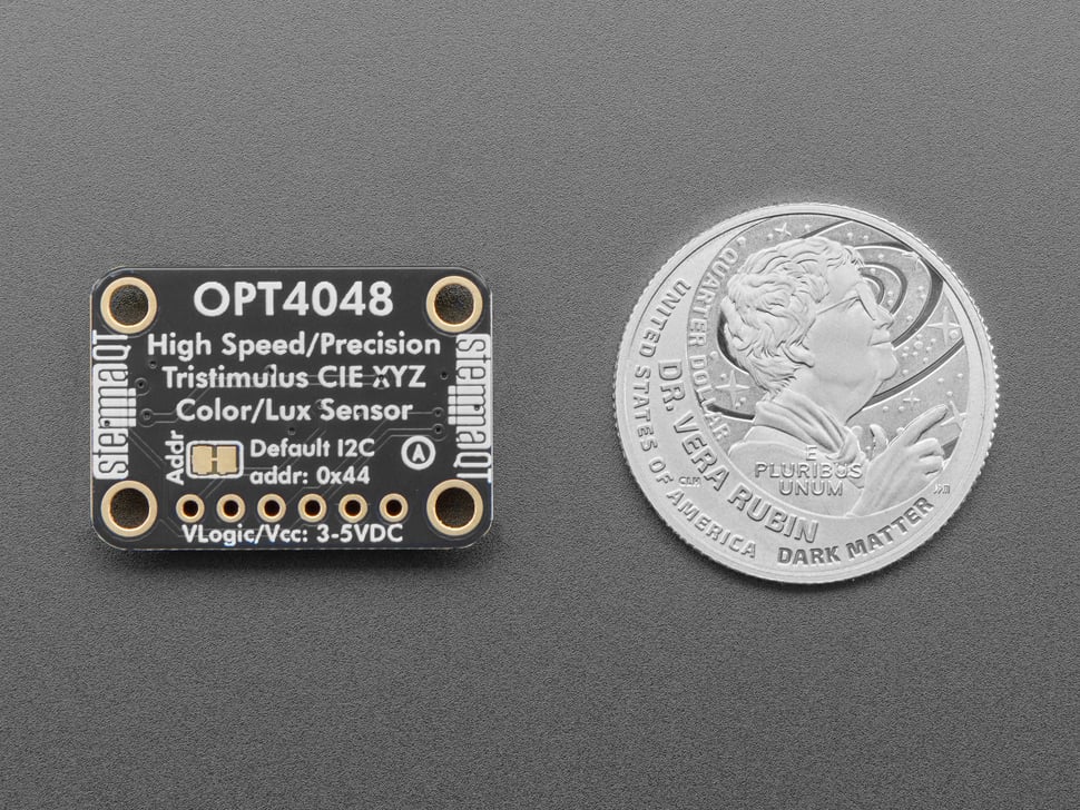 The Adafruit OPT4048 Tri-Stimulus XYZ Color, Light Temperature and Lux Sensor is a modern take on the common 'RGB' color sensor: this time with true "CIE" XYZ output so you can match it to your existing color space. It's also excellent for calculating color temperature, which is based on CIE, and as a bonus also has Lux calculation, up to 144 kLux for light measurement even in the brightest situations.