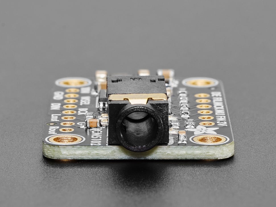 This breakout makes I2S digital audio easy: all you need to do is power it with 3~5VDC, and provide BCLK (bit clock), WSEL (left/right word select), and DIN (data in). The data lines are 3.3V logic only. By default it's configured for I2S but you can also do Left-Justified by toggling the Format pin. Audio can be 16, 24 or 32-bit wide, the chip will automagically determine the right format from the WSEL / BCLK ratio. No MCLK pin is needed, the chip will auto-generate it internally from the bit clock - or you can provide it on the MCLK input if you want.