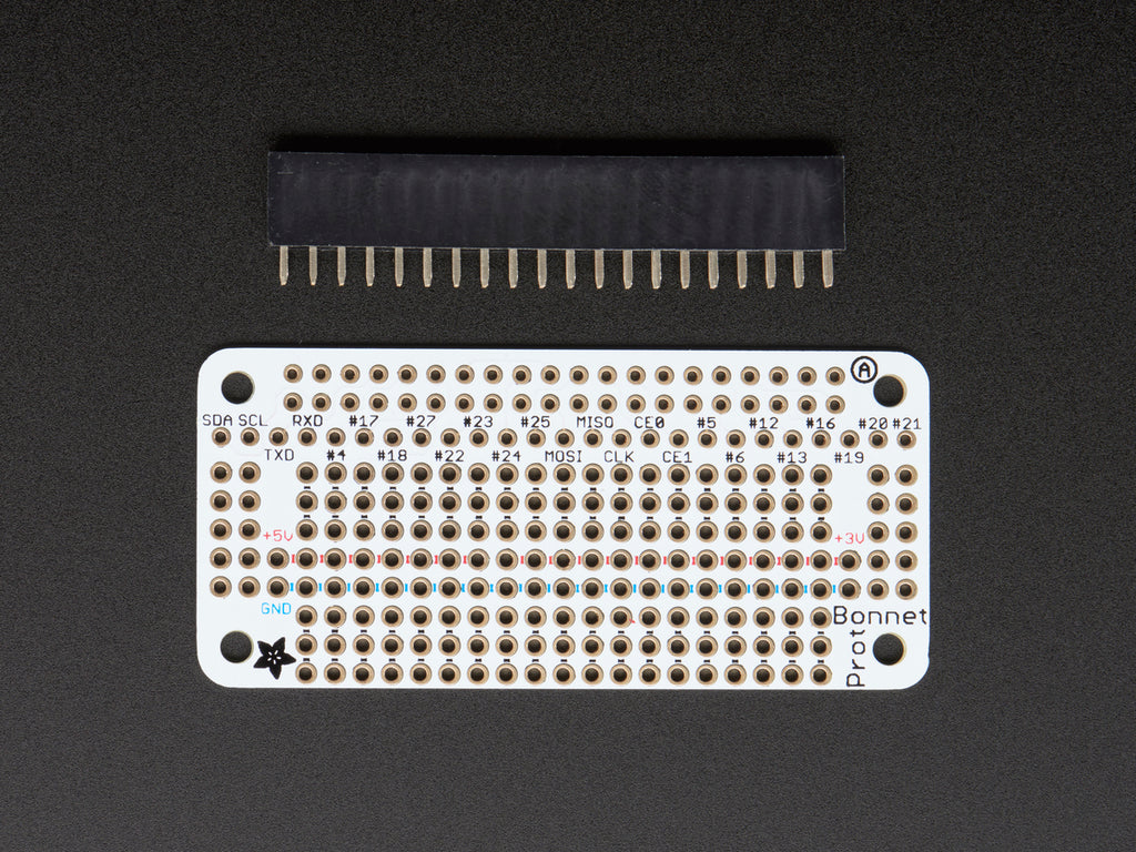 The Perma-Proto Bonnet comes with a printed circuit board and a single 2x20 GPIO Header for Raspberry Pi to put your Perma-Proto on top of your Raspberry Pi Zero (like a nice little bonnet...). Unlike our Perma-Proto HATs, this design does not include an EEPROM, so you can 'stack' it with other Bonnets and pHATs without worrying about an EEPROM address collision.