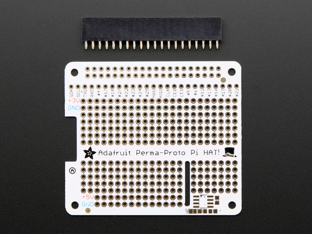 This is just the basic version of our Perma-Proto HAT. It comes with a printed circuit board and a single 2x20 GPIO Header for Raspberry Pi to put your Perma-Proto on top of your Raspberry Pi (like a nice little hat...) This version does not come with an EEPROM so you can 'stack' it with other HATs without worrying about an EEPROM address collision.