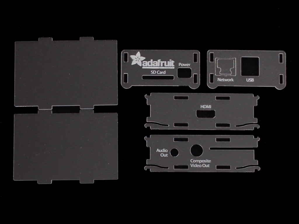 The case comes as 6 pieces that snap together, made of crystal-clear acrylic. This ingenious design has no screws or standoffs and there are cute little feet cut into the sides so that it stands up above your desk. There are engraved labels on all the connector slots. You can use all of the connectors on the edges of the Pi: HDMI, Audio, Video, SD slot, micro USB power, Ethernet and the two USB ports. We also added a slot so that you can connect a 26-pin IDC cable to the GPIO breakout pins on the Pi and pass it though the case. For more advanced hacking, the enclosure is designed so that you can remove the top piece and plug any sort of cables you wish into the breakouts in the middle. The case is airy enough that no additional vents or cooling is required - we tested the enclosed Pi over a 24 hour period at full load with no significant increase in temperature.