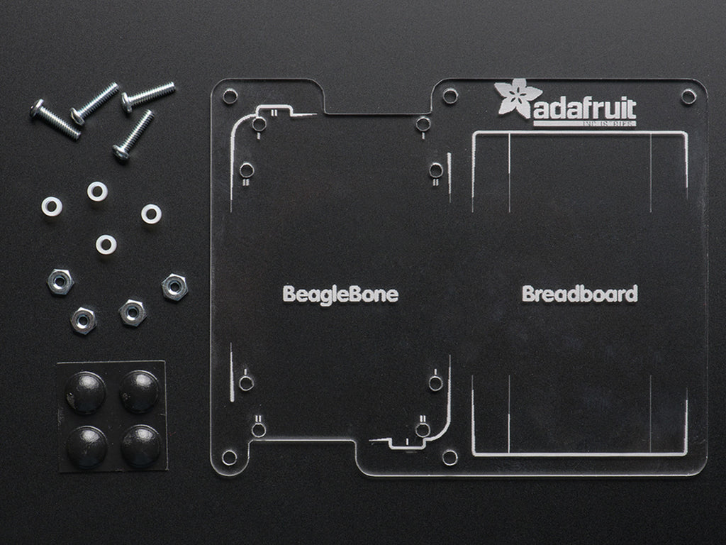 The plate is made of 3mm thick laser-cut clear acrylic with nice engraving showing alignment. There are four 4-40 screws, standoffs and hex-nuts to attach the 'Bone on and the halfsized breadboard can be stuck on (just remove the paper backing from it). Finally, there are four rubber bumpers you can use to lift the plate off of your table, so it won't slide around.