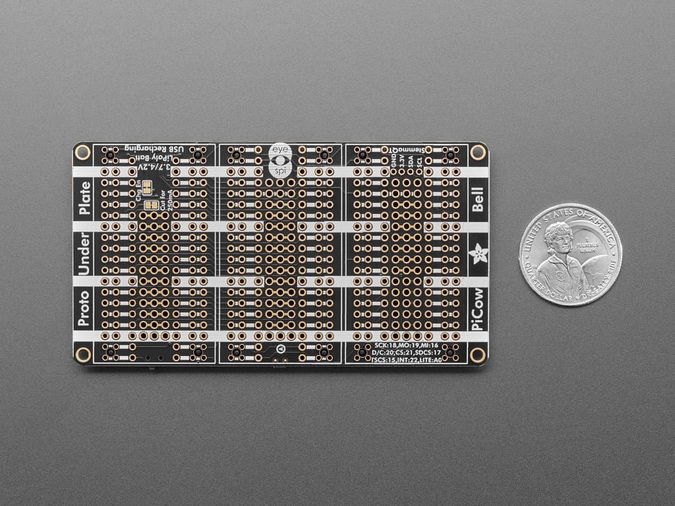 This board has double-row sockets already soldered on; you can plug in your Pico and 'Bell boards directly and access a prototyping area underneath and a second row of socket pins. The second row means you can connect wires just by poking them into the header, either directly to LEDs or buttons or to jumper to a breadboard. So you don't have to look up or count pins; each socket is nicely labeled. There are also 4 mounting holes for easy attachment to an underplate.