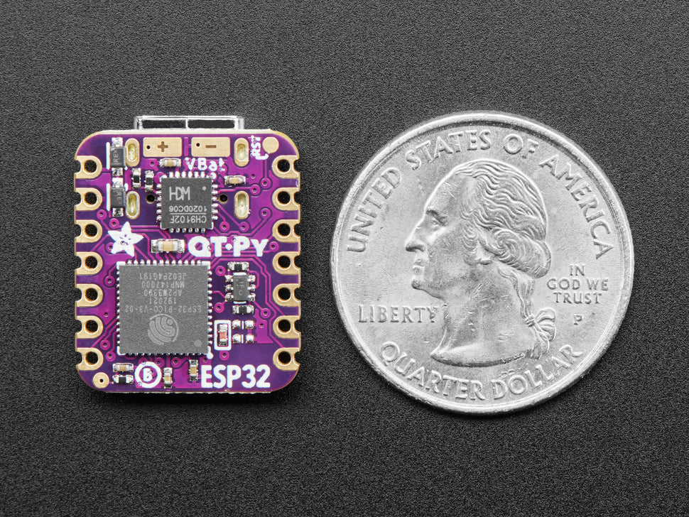 At the core of ESP32-PICO-V3-02 is the ESP32 (ECO V3) chip, which is a single 2.4 GHz Wi-Fi and Bluetooth combo chip designed with TSMC’s 40 nm low-power technology. ESP32-PICO-V3-02 integrates all peripheral components seamlessly, including a crystal oscillator, flash, PSRAM, filter capacitors, and RF matching links in one single package. This makes it perfect for stuffing into such a small space as the QT Py.