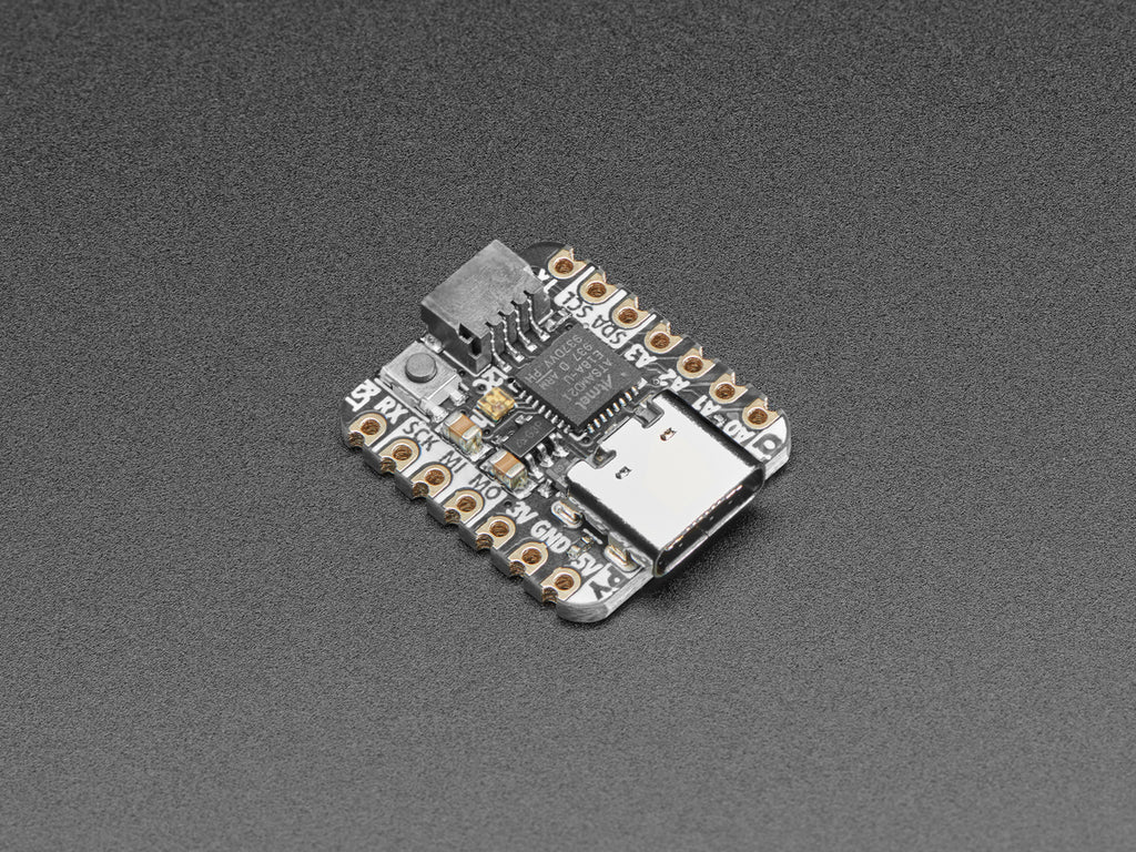 Pinout and shape is Seeed Xiao compatible, with castellated pads so you can solder it flat to a PCB. In addition to the QT connector, we also added an RGB NeoPixel (with controllable power pin to allow for ultra-low-power usage), and a reset button (great for restarting your program, or entering the bootloader)