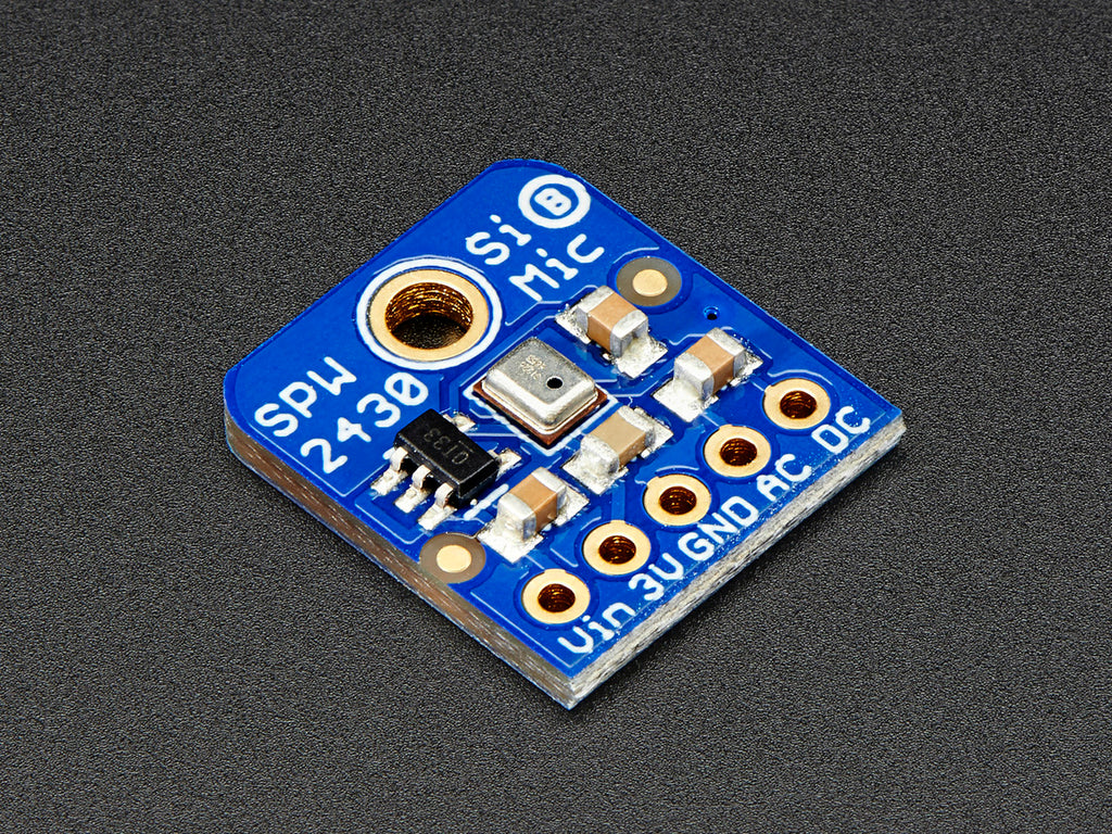 Listen to this good news - we now have a breakout board for a super tiny MEMS microphone. Just like 'classic' electret microphones, MEMS mics can detect sound and convert it to voltage, but they don't need a bias resistor or amplifier, its all in one! The SPW2430 is a small, low cost MEMS mic with a range of 100Hz - 10KHz, good for just about all general audio recording/detection.