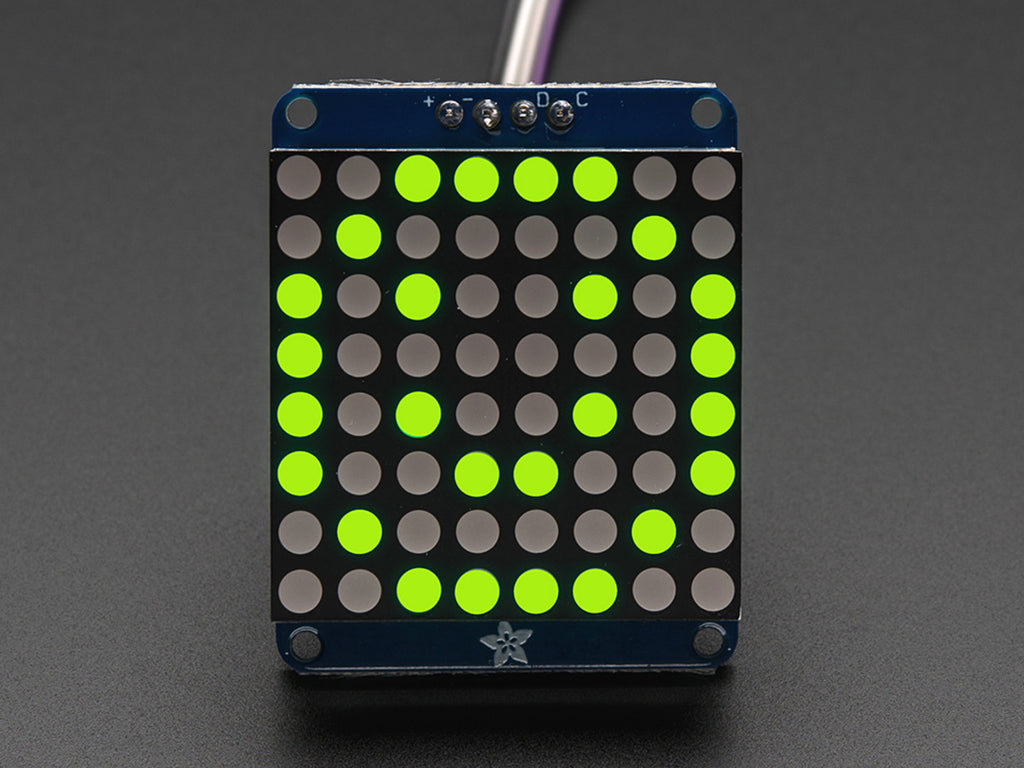 What's better than a single LED? Lots of LEDs! A fun way to make a small display is to use an 8x8 matrix or a 4-digit 7-segment display. Matrices like these are 'multiplexed' - so to control 64 LEDs you need 16 pins. That's a lot of pins, and there are driver chips like the MAX7219 that can control a matrix for you but there's a lot of wiring to set up and they take up a ton of space. Here at Adafruit we feel your pain! After all, wouldn't it be awesome if you could control a matrix without tons of wiring? That's where these lovely LED matrix backpacks come in. We have them in three flavors - a mini 0.7" 8x8, a small 1.2" 8x8 and a 4-digit 0.56" 7-segment. They work perfectly with the matrices we stock in the Adafruit shop and make adding a bright little display trivial.