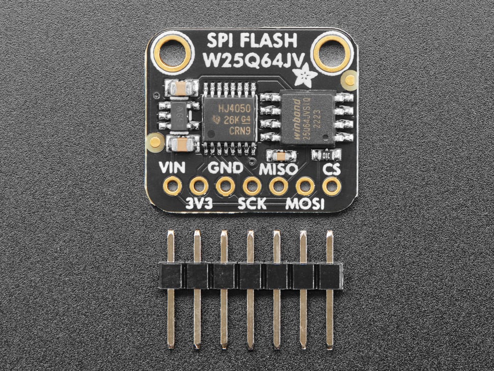 Sometimes you need a little extra storage for your microcontroller projects: for files, images, fonts, audio clips, etc. If you need lots of space, like in the gigabytes, we always recommend an SD card because you can easily plug it into a computer to edit files. But sometimes you don't need whole gigabytes; you just need a megabyte or two, with the lower cost and power usage that comes with it. That's when we recommend an Adafruit SPI FLASH Breakout such as this one that is fitted with a W25Q64 - 64 Mbit / 8 MByte chip.