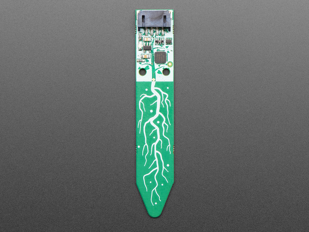 This design is superior with a capacitive measurement. Capacitive measurements use only one probe, don't have any exposed metal, and don't introduce any DC currents into your plants. We use the built in capacitive touch measurement system built into the ATSAMD10 chip, which will give you a reading ranging from about 200 (very dry) to 2000 (very wet). As a bonus, we also give you the ambient temperature from the internal temperature sensor on the microcontroller, it's not high precision, maybe good to + or - 2 degrees Celsius.