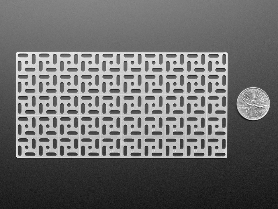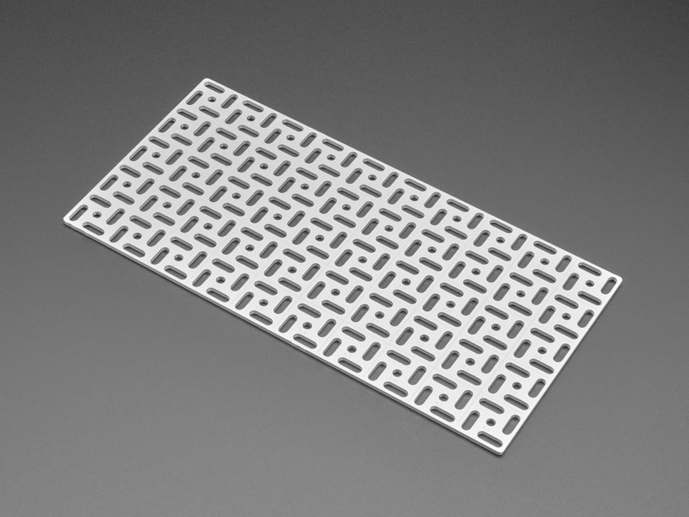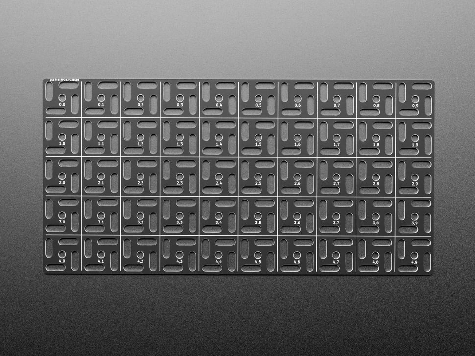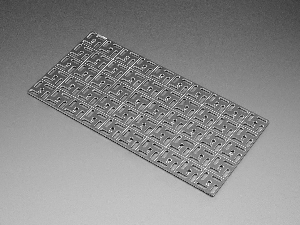 The grid is made out of an 'aluminum PCB' - we have that in quotes because while technically it is made with a PCB process for single-sided aluminum-core PCBs, there's no actual copper on here, its just the aluminum backing, and then black soldermask with silkscreen. The aluminum is conductive both electrically and thermally - so watch out if you are using metal screws to attach stuff. Unless, that is, you want to turn the whole thing into a ground plane in which case: go for it.