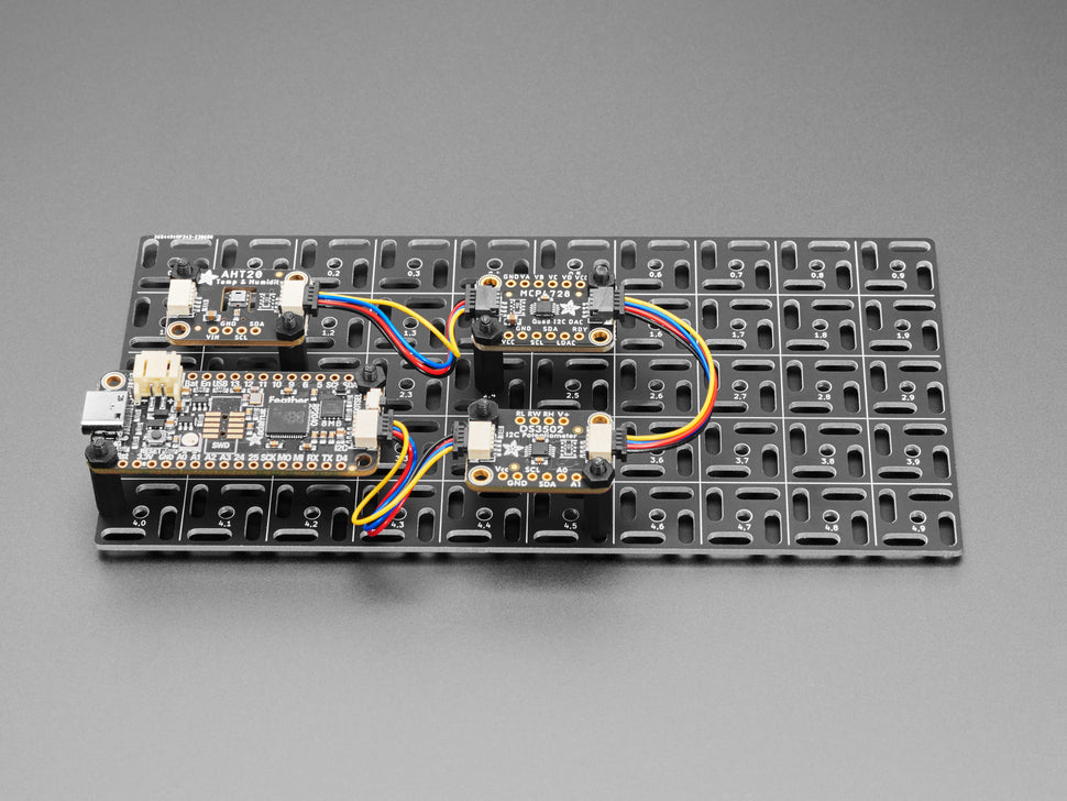 With dev boards, sensors & feathers sporting stemma QT ports, projects w/ 6 boards can be quickly assembled. But no breadboard for a mechanical substrate. So we created this swirly grid design to easily mount microcontroller & sensor boards.