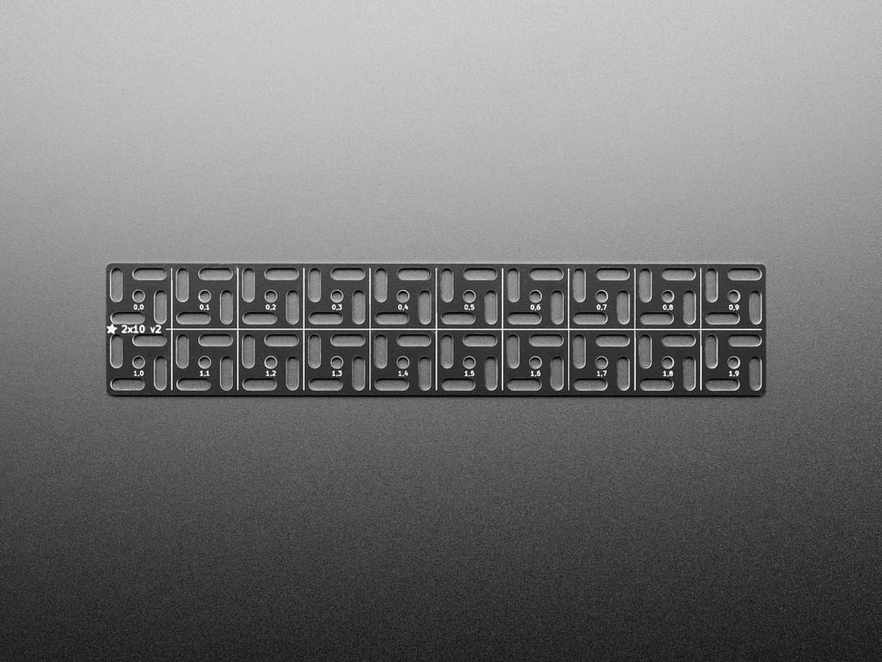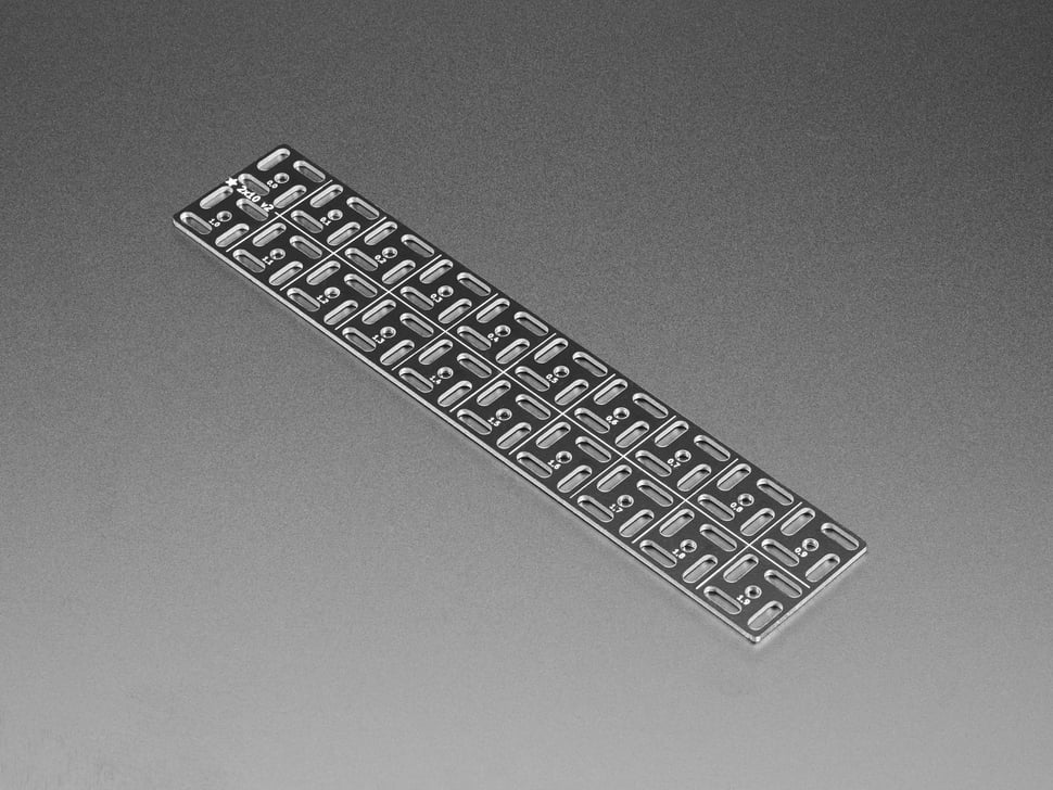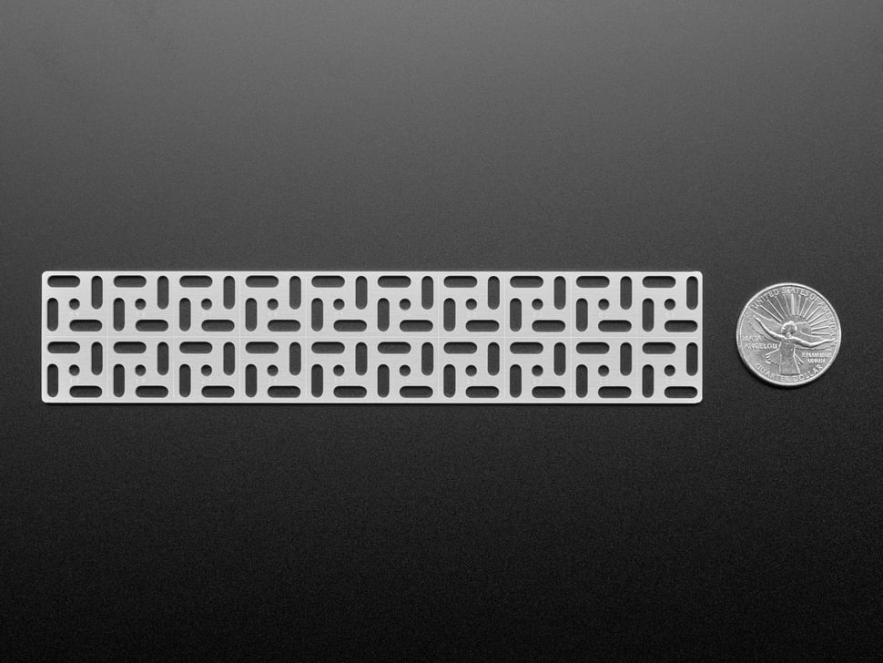 The grid is made out of an 'aluminum PCB' - we have that in quotes because while technically it is made with a PCB process for single-sided aluminum-core PCBs, there's no actual copper on here, its just the aluminum backing, and then black soldermask with silkscreen. The aluminum is conductive both electrically and thermally - so watch out if you are using metal screws to attach stuff. Unless, that is, you want to turn the whole thing into a ground plane in which case: go for it.
