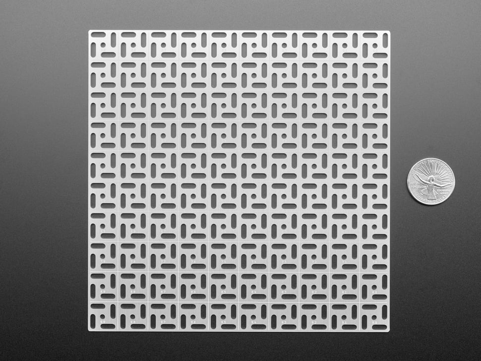 The grid is made out of an 'aluminum PCB' - we have that in quotes because while technically it is made with a PCB process for single-sided aluminum-core PCBs, there's no actual copper on here, its just the aluminum backing, and then black soldermask with silkscreen. The aluminum is conductive both electrically and thermally - so watch out if you are using metal screws to attach stuff. Unless, that is, you want to turn the whole thing into a ground plane in which case: go for it.