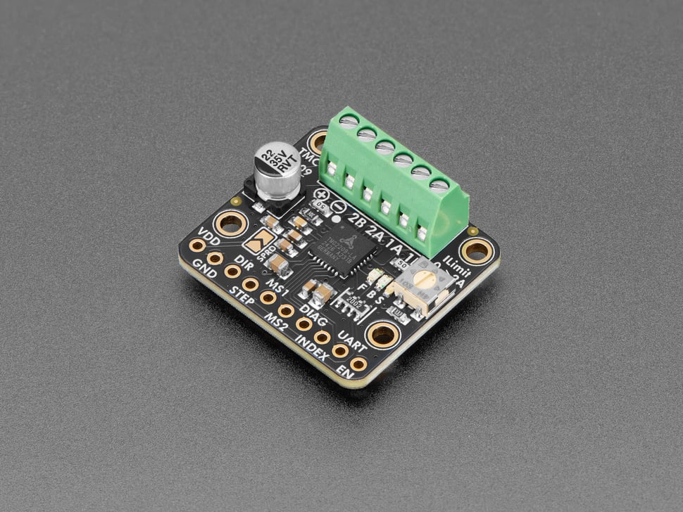 The Trinamic TMC2209 is a popular driver chip, with small breakout boards used in many 3D printers. Those breakouts are great for plugging into motherboards, but are a little tough to use for prototyping. Our version comes with terminal blocks for the motor power and stepper wires, plus nicely labeled pins for control and mounting holes.