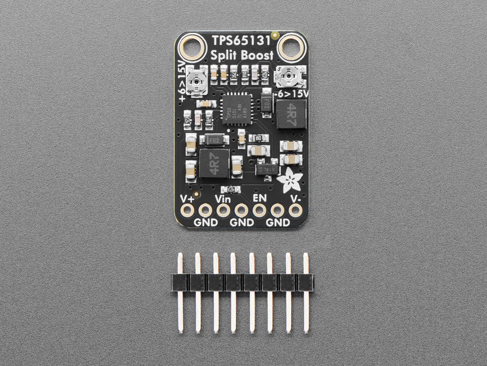 Need those tricky split-rail voltages for your vintage electronics? The Adafruit TPS65131 Split Rail Boost Converter generates both positive and negative voltage rails from a single 3-5V input. This makes it great for mimicking or replacing a transformer-based power supply or something that needs negative bias. We kept the design compact, and it even has adjustable output pots, so you can tune the voltages from about +6~+15VDC and -6~15VDC. Perfect for use with audio or retro projects now that transformer supplies are hard to get, or if you want to have something that could run on battery or USB.